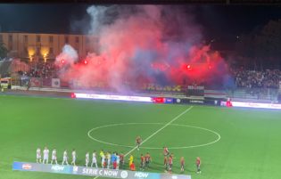 CASERTA – Una coreografia da brividi per il ritorno in Serie C della Casertana. Negli istanti in cui la compagine rossoblu ha fatto il proprio ingresso sul terreno di gioco contro il Benevento, davanti agli oltre 6mila spettatori del “Pinto”, i Fedayn Bronx hanno inscenato una bella coreografia di colore rossoblu ed anche di fumogeni. Tanti applausi da parte di tutto lo stadio per un momento atteso due anni e mezzo.