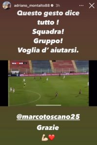 CASERTA – Il gruppo della Casertana è più che mai unito. Lo si percepisce da ogni dettaglio ed in ogni momento. Basta guardare la condivisione della gioia al triplice fischio della sfida di Taranto per capire come tutti stiano remando verso la stessa direzione. Ed un altro esempio lo rimarca Adriano Montalto. Su instagram, piattaforma su cui i calciatori descrivono spesso le proprie sensazioni, il “Tagliagole” pubblica una story in cui condivide un video e scrive: “Questo gesto dice tutto! Squadra! Gruppo! Voglia d’aiutarsi” a cui aggiunge “Marco Toscano grazie“. Il riferimento nel video è al gesto del centrocampista rossoblu che, al minuto 72′, sta tornando da un’azione offensiva, passa davanti a Montalto e lo sprona a dare una mano in fase difensiva, nel momento in cui il Taranto stava attaccando. L’emblema dell’unione del gruppo della Casertana, a cui a fine conferenza stampa Vincenzo Cangelosi tributa la vittoria: “La dedico ai miei calciatori e loro sanno il motivo“.
