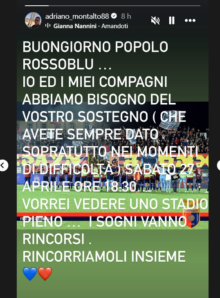 “Buongiorno popolo rossoblu…io ed i miei compagni abbiamo bisogno del vostro sostegno (che avete sempre dato soprattutto nei momenti di difficoltà) sabato 27 aprile alle ore 18:30 vorrei vedere uno stadio pieno. I sogni vanno rincorsi. Rincorriamoli insieme”.