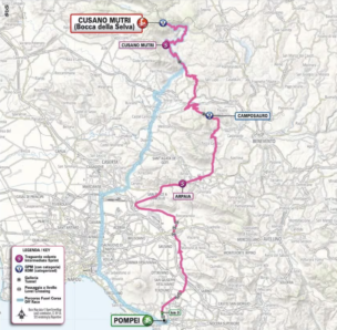 Dopo un giorno di meritato riposo, martedì 14 maggio è la volta dei 142 chilometri che dividono Pompei da Cusano Mutri, percorso della decima tappa del Giro d’Italia 2024 che per un giorno distoglierà lo sguardo degli sportivi del posto dagli impegni del calcio d’Eccellenza e si porterà tutto sul mondo delle due ruote in una grande festa. Qui si inizia a fare sul serio con qualche salitella e una tappa complessiva che si può definire di media montagna. La prima parte di tappa è abbastanza comoda, buona per riscaldare le gambe, ma da San Felice a Cancello iniziano i primi strappi, con la salita verso Arpaia e poi verso Bivio Taburno che portano al primo GPM di seconda categoria di Camposauro, con un allungo di 6,1 km al 7,8% e una pendenza massima del 14%. Dopo una lunga discesa si torna a salire verso Guardia Sanframondi e Cusano Mutri e poi ancora verso l’ultimo grande sforzo in direzione di Bocca della Selva a 1392 metri, con un GPM di prima categoria suddiviso in tre parti dove il picco è al 14% in prossimità di Pietraroja e con gli ultimi sei chilometri e mezzo tra il 7 e l’8%.