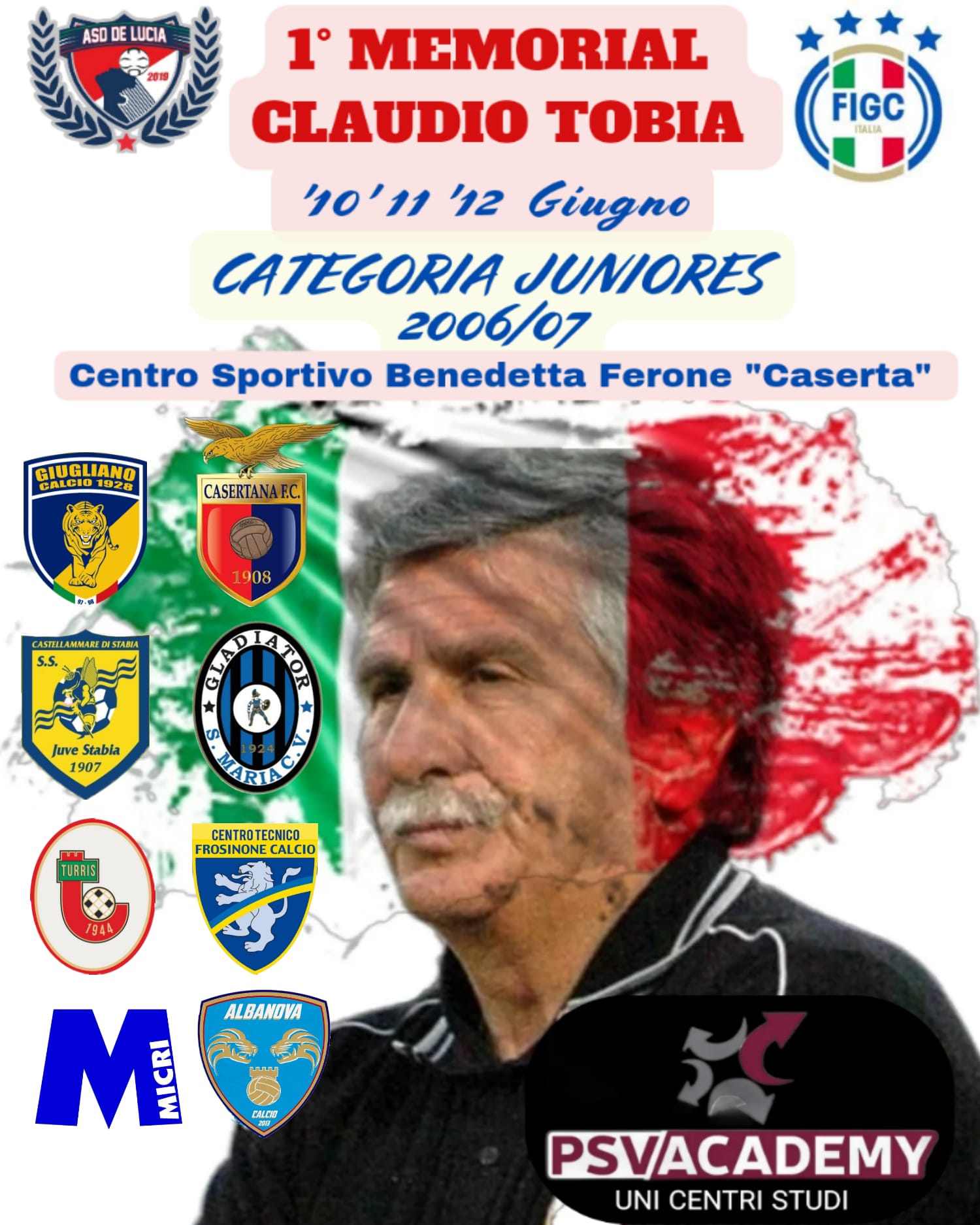 Tre giorni dedicati alla memoria di mister Claudio Tobia. Dal 10 al 12 giugno presso il Centro Sportivo Benedetta Ferone di Caserta si svolgerà il primo memorial per ricordare Claudio Tobia. Organizzato dall’Asd De Lucia, il torneo è riservato alla categoria juniores 2006-2007 e vedrà coinvolte otto squadre. Casertana, Giugliano, Juve Stabia, Gladiator, Turris, Il Centro Tecnico del Frosinone, Micri e Albanova. Una vera e propria festa che si svolgerà da lunedì pomeriggio 10 giugno e si concluderà due giorni dopo con la fase finale. Voluto fortemente dal Presidente Antonio De Lucia dell’omonima scuola calcio, sarà anche l’occasione per vedere all’opera tanti talenti della nostra terra che non si risparmieranno dando vita a partite dall’alto contenuto tecnico.