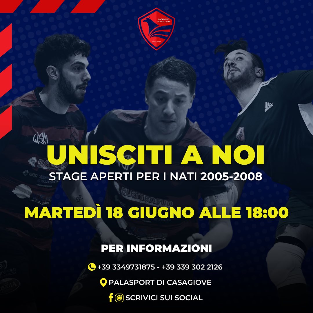 Importante stage per tutti gli aspiranti calcettisti che sognano di poter entrare a far parte di un club che milita nel campionato nazionale di serie B. Martedì 18 giugno alle 18 presso il palasport di Casagiove tutti i nati dal 2005 al 2008 avranno l’occasione di potersi esibire in un provino supervisionati dallo staff tecnico rossoblù. Sarà il primo passo verso la nuova stagione che scatterà a ottobre ma il club del presidente Costanzo è già a lavoro per un’oculata programmazione.