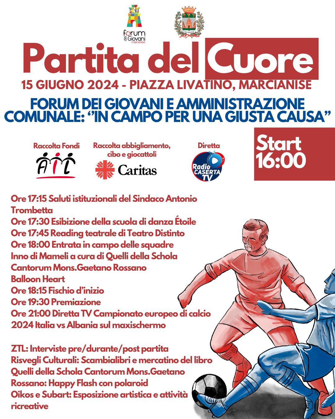 All’iniziativa prenderanno parte anche diverse associazioni del territorio, tra le quali: ZTL – Zerotensionilocali con le interviste a bordo campo, Risvegli Culturali con lo scambialibri, il mercatino del libro ed expo, Oikos e Subart con esposizioni artistiche e attività ricreative, Quelli della Schola Cantorum Mons. Gaetano Rossano anche con uno stand ‘’happy flash’’. L’evento sarà trasmesso in diretta da RadioCaserta Tv.