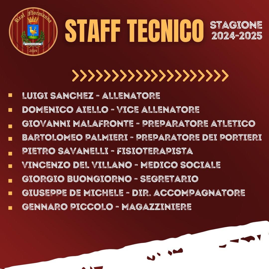 La Real Normanna comunica lo staff tecnico per la stagione 2024/25. Per il campionato di Eccellenza mister Luigi Sanchez potrà contare su validi collaboratori che sicuramente daranno il loro contributo per vivere INSIEME un’annata indimenticabileDomenico Aiello è stato scelto per il ruolo di vice allenatore; Giovanni Malafronte invece sarà il preparatore atletico; Bartolomeo Palmieri sarà il preparatore dei portieri; Pietro Savanelli scelto come fisioterapista del gruppo; Giorgio Buongiorno si occuperà di tutta la parte di Segreteria; mentre il medico sociale sarà Vincenzo Del Villano; magazziniere Gennaro Piccolo