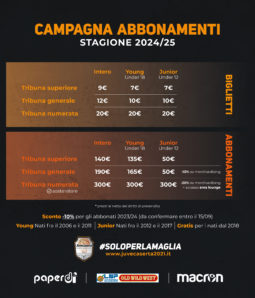 La campagna abbonamenti prevede anche i “ridotti” per le fasce Young (nati fra il 2006 e il 2011) e Junior (nati fra il 2012 e il 2017), sia per l’acquisto del biglietto che per l’abbonamento dei settori tribuna superiore e tribuna generale. Ingresso libero invece per gli under 6 (nati dal 2018).