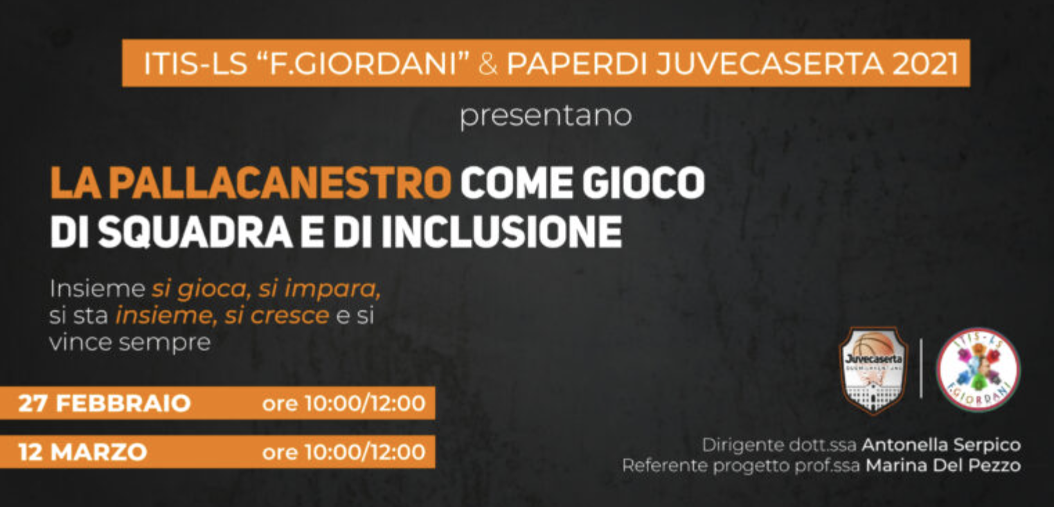 Il club manager della Juvecaserta 2021, Biagio Sergio, l’allenatore Damiano Cagnazzo e due giocatori della prima squadra della Paperdi saranno i protagonisti dell’incontro sul tema: “La pallacanestro come gioco di squadre e di inclusione” promosso ed organizzato dall’ITIS “Francesco Giordani”, su iniziativa della dirigente, dr.ssa Antonella Serpico, ed organizzato con la collaborazione della referente scolastica, prof.ssa Marina Del Pezzo.