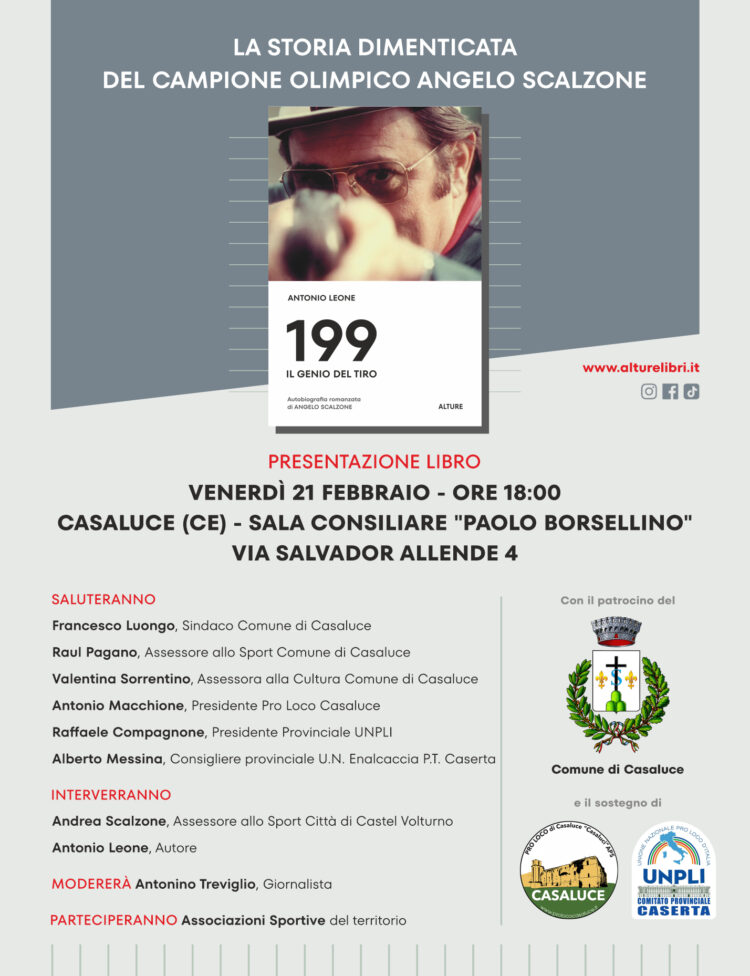Venerdì 21 febbraio, alle ore 18:00, la Sala consiliare “Paolo Borsellino” di Casaluce, sita in via Salvador Allende 4, ospiterà la presentazione del libro 199 – Il genio del tiro, Autobiografia romanzata di Angelo Scalzone, il Campione olimpico nativo dell’Agro aversano che conquistò la medaglia d’oro nel Tiro a Volo, Specialità Fossa Olimpica, ai Giochi Olimpici di Monaco 1972. Scritto da Antonio Leone, il volume ripercorre la vita e la carriera dell’atleta, dall’infanzia fino alla prematura scomparsa nel 1987, ricostruendo con ampi dettagli e approfondimenti storici il percorso sportivo e umano dell’atleta, dedicando ampie pagine alla ricostruzione integrale della gara di Monaco. “Sarà l’occasione – ha dichiarato l’autore – di ricordare un Campione che ha lasciato un segno indelebile nella storia dello sport italiano, purtroppo sconosciuto alle nuove generazioni, ma ancora capace, cinquant’anni dopo, di ispirare e affascinare”. “Questo libro – hanno dichiarato gli assessori Raul Pagano e Valentina Sorrentino – è il risultato di un lungo lavoro di ricerca storica e sportiva, nato in particolare dalla volontà dell’autore di restituire alla memoria collettiva, soprattutto di noi conterranei di Scalzone, non solo il Campione, ma soprattutto l’uomo dietro il mito, i suoi valori e il suo legame con le origini. La sua storia è infatti un esempio di talento, sacrificio e determinazione, in cui tutti possiamo rispecchiarci”.