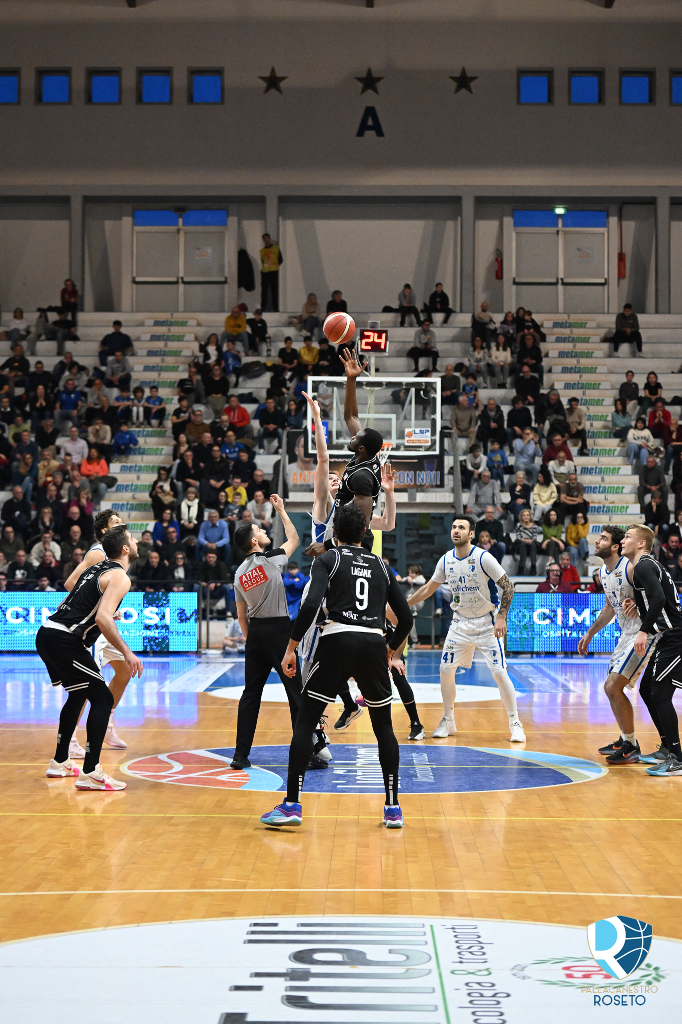 La Liofilchem Roseto mantiene la sua imbattibilità interna ma deve impegnarsi non poco per avere la meglio su una Paperdi Juvecaserta, rimasta a contatto con i padroni di casa fino a metà dell’ultimo periodo di gioco. I bianconeri di coach Damano Cagnazzo hanno avuto un buon impatto sulla gara puntando molto sul gioco collettivo e trovando spesso la soluzione migliore per andare a canestro. Alla fine, i casertani hanno pagato la maggiore reattività a rimbalzo degli abruzzesi (39-29) e due decisivi tiri dalla distanza di Pastore.