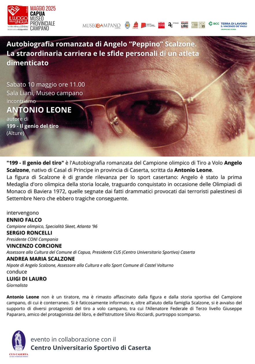 Sabato 10 maggio 2025, alle ore 11:00, presso la Sala Liani del Museo Campano di Capua, in via Roma 68, si terrà la presentazione del libro “199 – Il genio del tiro”, Autobiografia romanzata di Angelo Scalzone, il leggendario tiratore campano che conquistò la medaglia d’oro nel Tiro a Volo, Specialità Fossa Olimpica, ai Giochi di Monaco 1972 con l’eccezionale punteggio di 199/200 – record tuttora imbattuto in gare olimpiche da 200 piattelli.
