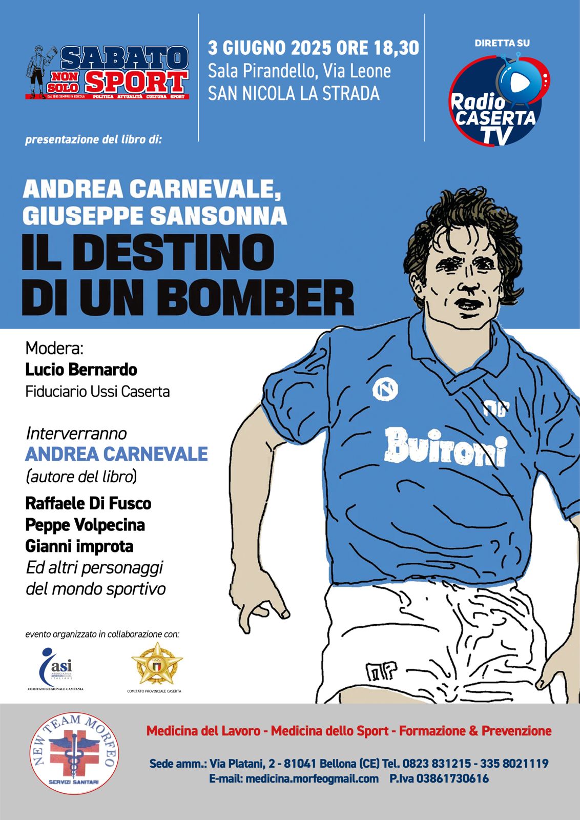“Il destino di un bomber” è il titolo del libro scritto dal calciatore Andrea Carnevale insieme con Giuseppe Sansonna autore e regista di Rai Cultura, che sarà presentato martedì 3 giugno alle 18:30 presso il teatro Pirandello di San Nicola la Strada sito in via Giovanni Leone. Con l’autore del libro interverranno anche i suoi ex compagni di squadra del primo scudetto del Napoli Raffaele Di Fusco, Giuseppe Volpecina ed il ‘baronetto’ di Posillipo ovvero Gianni Improta. Moderatore della serata il giornalista sportivo Lucio Bernarda fiduciario dell’Unione Stampa Sportiva Italiana di Caserta. Interverranno molti altri personaggi del mondo sportivo che hanno assicurato la loro presenza alla serata organizzata a San Nicola la Strada da Gerardo Trombetta già presidente della Federazione Italiana Gioco Calcio di Caserta e grande appassionato del Napoli e della sua storia.