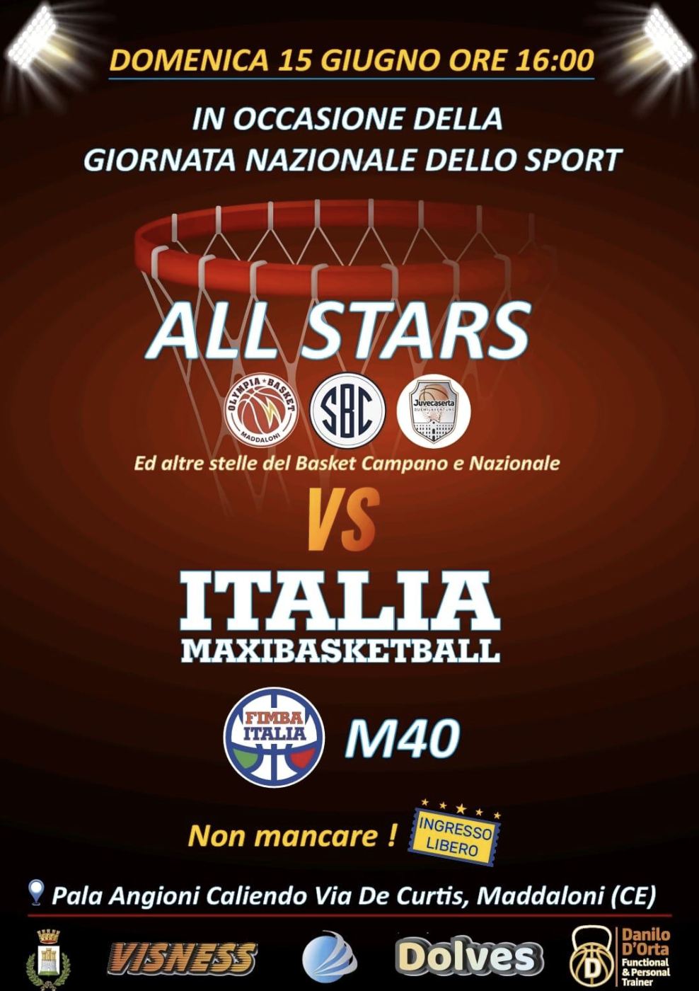 La Nazionale M40+ FIMBA arriva a Maddaloni. Il Pala Angioni-Caliendo ospiterà il prossimo 15 giugno alle ore 16:00 l’ultimo appuntamento degli azzurri prima dei Mondiali che si terranno in Ticino da fine giugno con uno scrimmage contro una selezione All Star guidata da Davide Mastropietro e Carlo Corbo, composta da alcuni dei migliori giocatori del panorama cestistico casertano, oltre ad alcune stelle del basket campano e Nazionale. Sarà una emozione forte per Danilo D’Orta, cestista dell’Olimpia Maddaloni e prodotto della pallacanestro casertana, che potrà vestire la maglia azzurra nella sua terra d’origine.