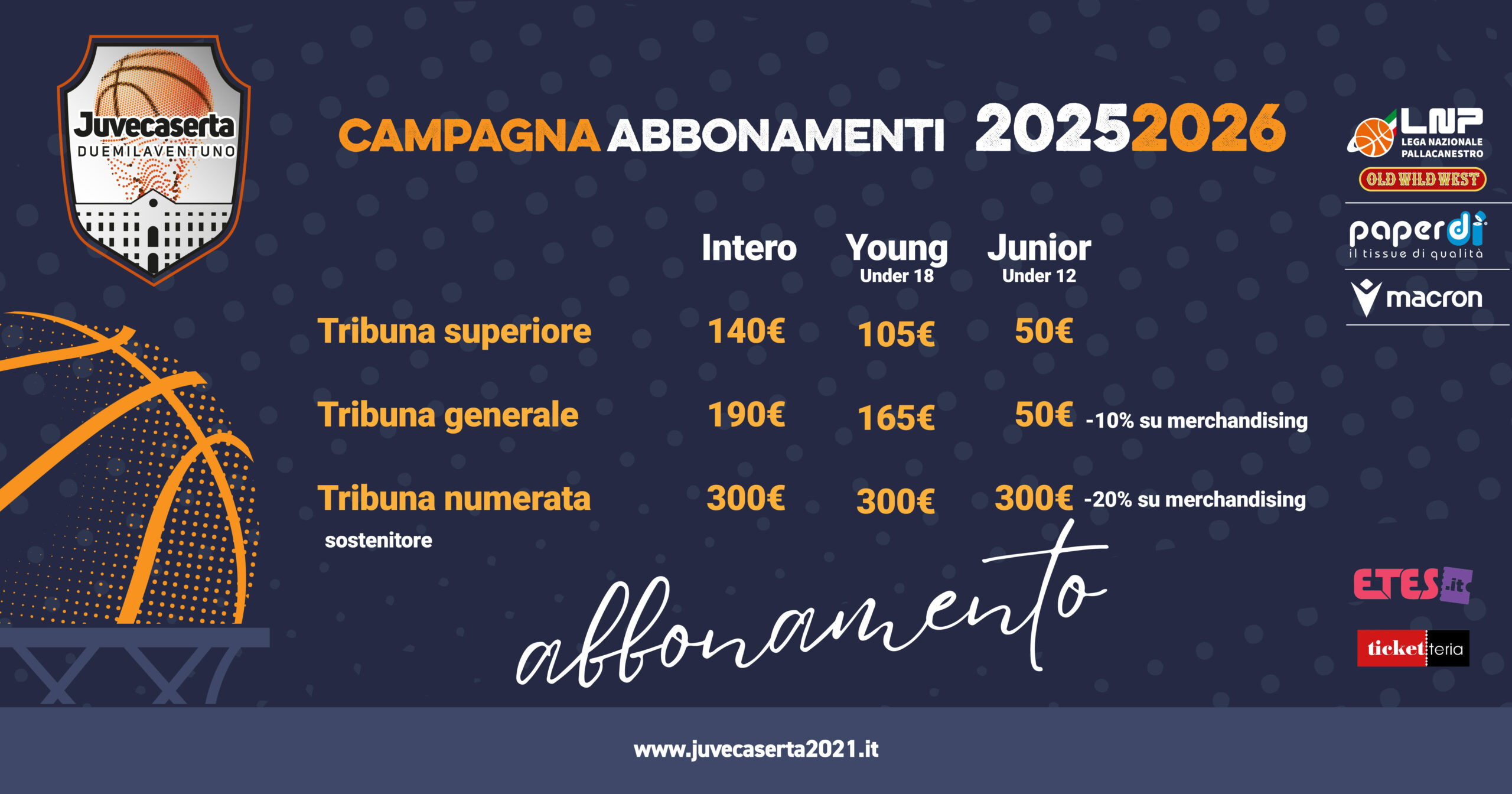 Dalle ore 16.00 di domani, lunedì 1 settembre, parte la vendita libera degli abbonamenti per la stagione 2025/2026. Oggi, infatti, è l’ultimo giorno utile per esercitare il diritto di prelazione sui posti di tribuna numerata occupati nello scorso campionato inviando una mail con la copia della card all’indirizzo mail abbonamenti@juvecaserta2021.it.