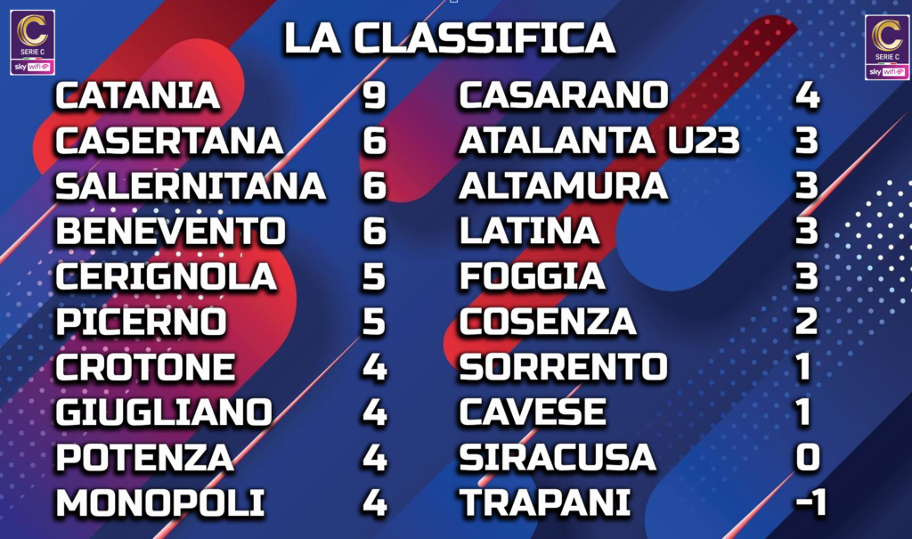 Al Foggia era stata inflitta una penalizzazione di tre punti per varie inadempienze amministrative e lo scorso 31 luglio arrivò la sentenza. Adesso invece il club rossonero è stato prosciolto e dunque in classifica ha tre punti. Ecco la nuova graduatoria.