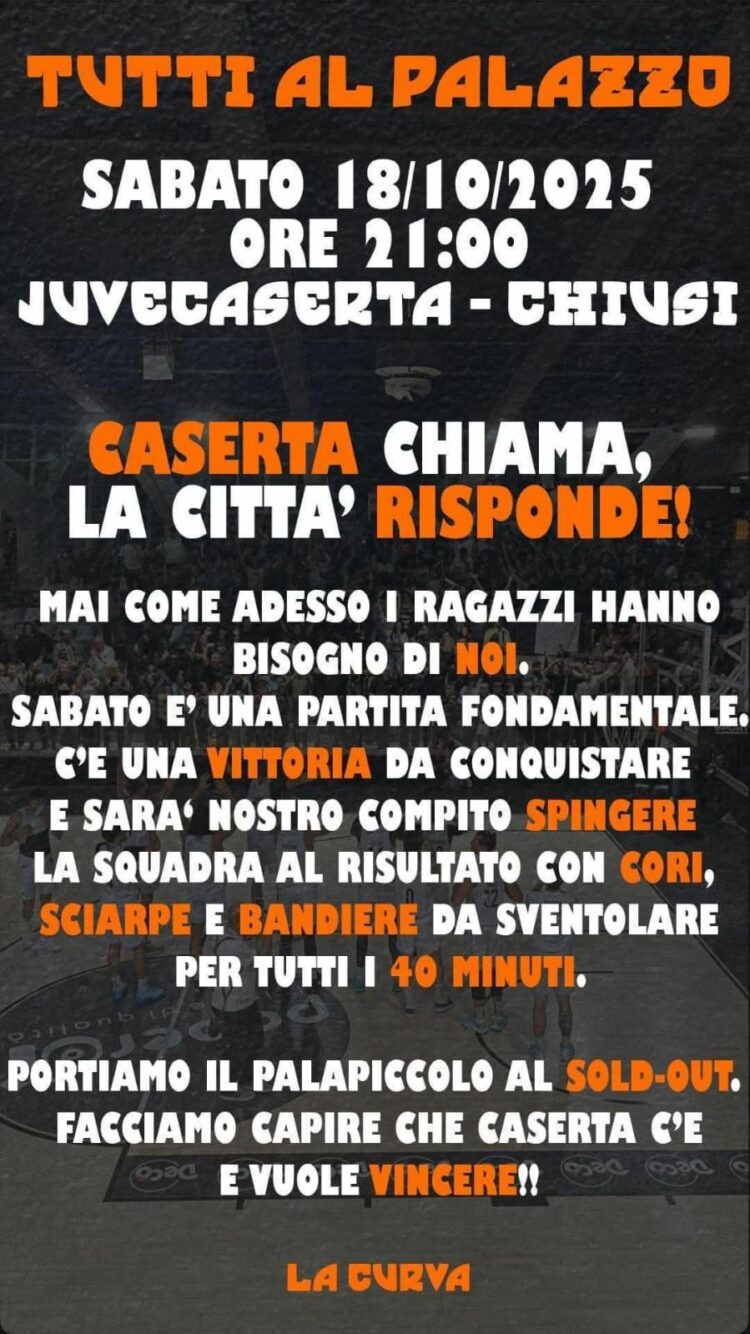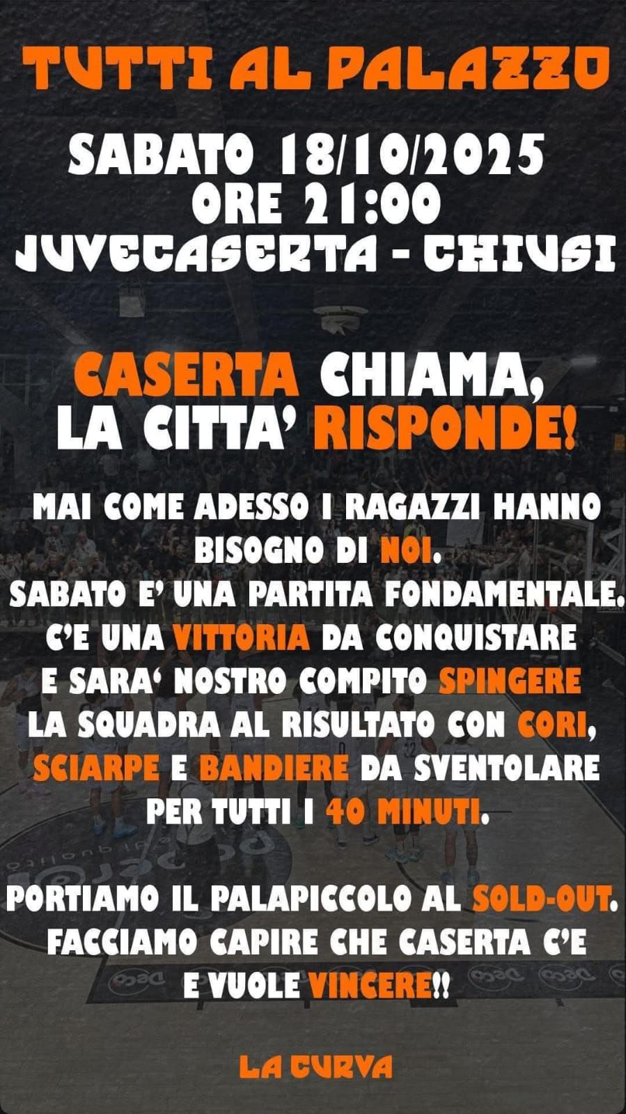 In vista della gara di domani contro Chiusi, i tifosi della Juvecaserta hanno diffuso questo invito attraverso i social.