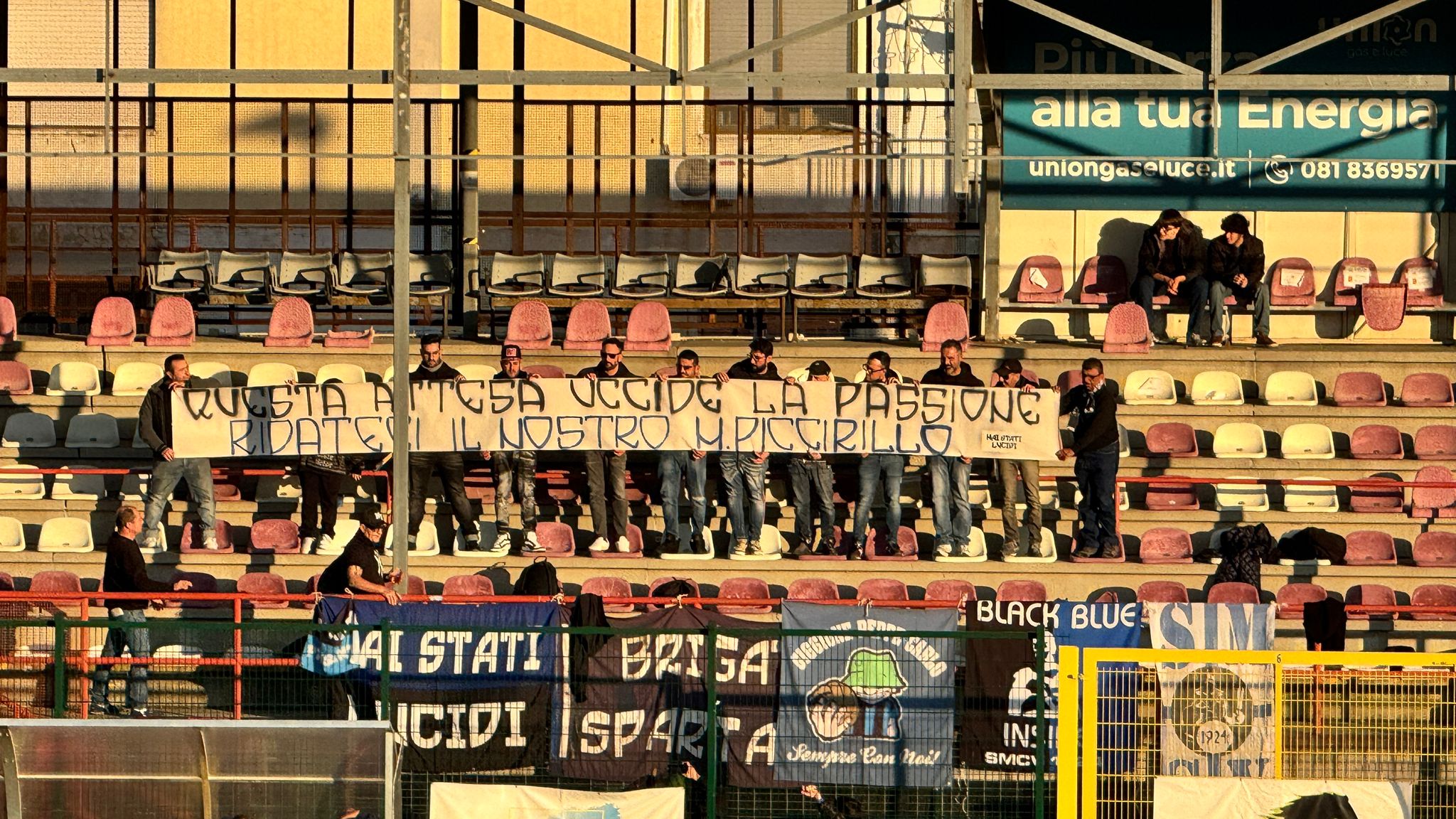Durante la vittoria contro la Sessana, uno striscione e un volantino sono apparsi sulle tribune del Bisceglia. Il disappunto degli ultras sammaritani è nel ritardo dei lavori dello stadio sammaritano. Lavori in corso e non ancora ultimati. Probabilmente per un altro mese minimo i nerazzurri dovranno giocare lontano da Santa Maria Capua Vetere.