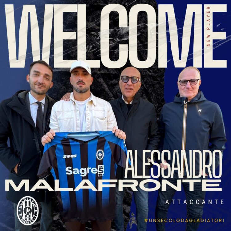 Dopo una lunga e complessa trattativa portata avanti dai massimi vertici societari, il Gladiator 1924 SSD A R.L. comunica con estrema soddisfazione di aver acquisito le prestazioni sportive dell’attaccante Alessandro Malafronte. Un ingaggio che rappresenta la grande volontà del club di voler essere protagonista e voler ambire a traguardi importanti. Si tratta di un ‘ritorno a casa’ per il bomber di Torre del Greco che a distanza di dieci anni vestirà nuovamente la maglia nerazzurra. E’ stato nelle ultime stagioni sempre ai vertici delle classifiche marcatori di Eccellenza. Una prima punta strutturata che vanta centinaia di partite tra Eccellenza, Serie D e serie C. Giovanili del Catania poi subito in prima squadra tra i pro con il Milazzo. Gioca con Scafatese, Savoia, Palmese, Gladiator, San Giorgio, Mariglianese, Pompei e nell’ultimo anno e mezzo all’Ercolanese. Il ds Marco Mignano è riuscito a strapparlo alla concorrenza e da sabato guiderà l’attacco dei gladiatori. “Felice per essere tornato in un club così importante come questo. Arrivo con grandi motivazioni e spero che i miei gol possano contribuire al raggiungimento degli obiettivi prefissati. Non vedo l’ora di scendere in campo e segnare per i nostri tifosi. Forza Gladiator”.