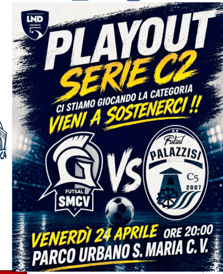 Santa Maria Capua Vetere si prepara a vivere una serata di grande intensità sportiva. Venerdì 24 aprile alle ore 20, presso il Parco Urbano, la Futsal SMCV scenderà in campo per giocarsi la permanenza nel campionato di Serie C2 di calcio a 5 contro il Futsal Palazzisi.